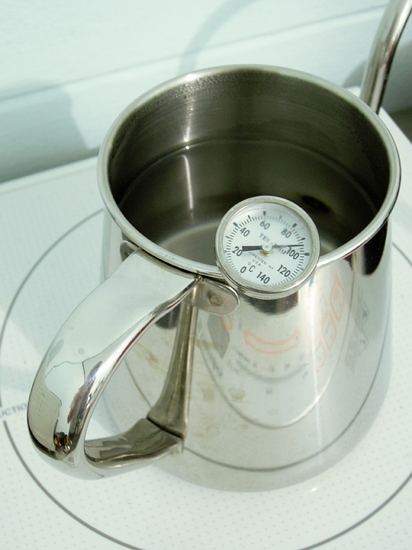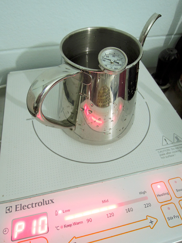 อ่ะ น้ำถึงอุณหภูมิที่ต้องการละ ให้รีบปิดไฟก่อนที่จะอุณหภูมิจะเลยไปนะครับ พออุณหภูมิประมาณ 90 น้ำก็จะเริ่มปุดๆ อย่างรุนแรงแล้ว ถ้าไม่มีเทอร์โมมิเตอร์ก็ให้ดูว่าน้ำมันเริ่มปุดๆ เหมือนจะเดือดหรือยัง แต่ภาพนี้น้ำนิ่งเพราะปิดไฟแล้วครับ น้ำอุณหภูมิต่างกันก็จะให้รสชาติกาแฟที่ต่างกันครับ