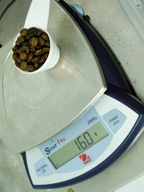 แล้วก็ชั่งหรือตวงกาแฟ ถ้าไม่มีตาชั่งก็ต้องกะเอา อย่างช้อนตวงพลาสติกอันนี้ได้กาแฟประมาณ 16 กรัม เราใช้วิธีชั่งน้ำหนักหรือตวงก็เพราะว่าเราต้องการควบคุมตัวแปรในการชงกาแฟ ถ้าใส่กาแฟเยอะไป กาแฟก็จะมีรสเข้ม ใส่กาแฟน้อยไป รสชาติก็อ่อนจืดเหมือนน้ำล้างถ้วย