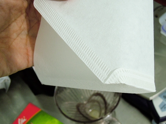 ขั้นต่อไปคือพับกระดาษกรองเพื่อเพิ่มความแข็งแรงของรอยต่อ เผื่อเจอกระทำรุนแรงกระดาษกรองอาจแยกจากกันได้ ผงกาแฟจะไม่ถูกกรอง วัตถุประสงค์ของการใช้กระดาษกรองก็จะโมฆะไป