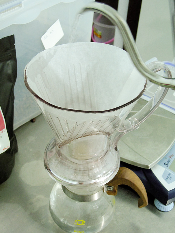 ขั้นต่อไปคือลวกกระดาษกรองเพื่อขจัดกลิ่นกระดาษออกไปก่อน ปกติ Clever Dripper จะมีวาล์วกันน้ำไหลออกอยู่ด้านล่าง ถ้าวางไว้บนพื้นราบ เวลาเทน้ำลงไปวาล์วจะยังปิดอยู่และน้ำจะไม่ไหล แต่เมื่อวางไว้บนปากภาชนะ วาล์วจะถูกดันขึ้น น้ำจึงไหลลงไปได้ ทำแบบในภาพนี้เราก็ได้อุ่นภาชนะและล้างกระดาษกรองไปในคราวเดียว
