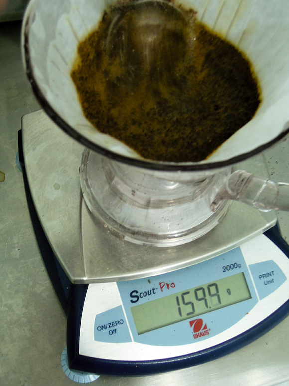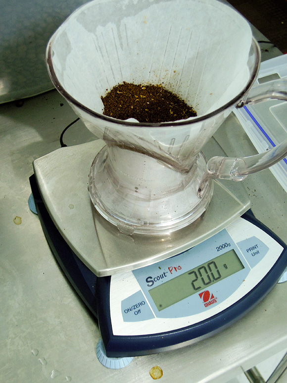 ผมจะแบ่งการเทน้ำเป็นสองรอบ รอบละครึ่งนึง สำหรับครั้งนี้เทครึ่งแรกคือ 160 กรัม แล้วก็เอาช้อนคนผงกาแฟไปมาประมาณ 10 ครั้ง แล้วก็ปล่อยทิ้งไว้ รอเวลาประมาณ 1:30 นาที ผมใช้วิธีชั่งน้ำหนักเพราะว่าการตวงน้ำนั้นทำได้ยาก ถ้าตวงก่อนต้มน้ำบางส่วนจะระเหยเป็นไอ ถ้าตวงหลังต้มอุณหภูมิน้ำจะตก ไม่อย่างนั้นก็ต้องตวงด้วยสายตาจากระดับน้ำที่อยู่ในตัว Clever Dripper