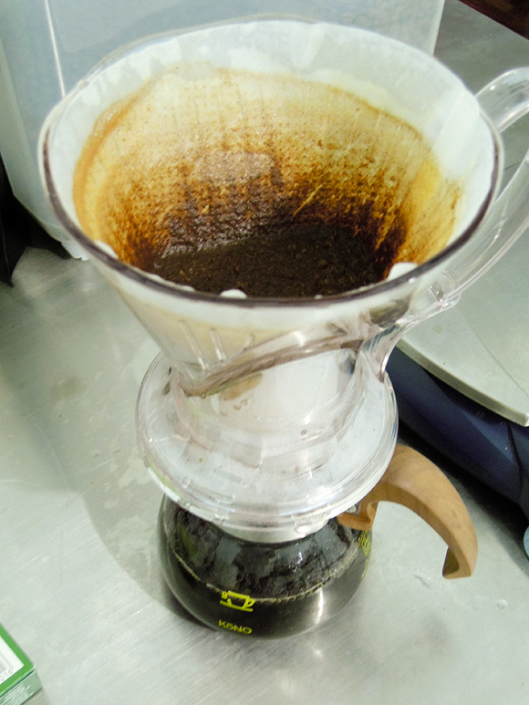 พอครบ 4 นาที ก็เอาขึ้นวางบนภาชนะปล่อยน้ำไหลออกมา พอเห็นผงกาแฟข้างบนแล้วยกออกเลยครับ เทน้ำร้อนที่ลวกถ้วยกาแฟไว้ทิ้งไป เอาช้อนคนๆ กาแฟในภาชนะก่อนแล้วจึงเทใส่ถ้วยพร้อมเสิร์ฟได้ทันทีครับ