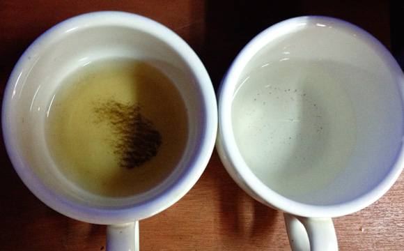 ถ้วยซ้ายมือเป็นน้ำแรกที่กดออกมาจากหัวกรุ๊ปหลังจากชงกาแฟเสร็จ สีเป็นน้ำชาเหมือนกัน มีผงมีตะกอนเหมือนกัน และผงดูขนาดใหญ่กว่าด้วย ส่วนถ้วยด้านขวาคือน้ำที่กดจากหัวกรุ๊ปต่อจากถ้วยซ้าย ดูสะอาดกว่าเยอะ แต่ก็ยังมีผงกาแฟหลงมาบ้าง ขนาดเอาไอโฟนถ่ายมามัวๆ ยังมองเห็น