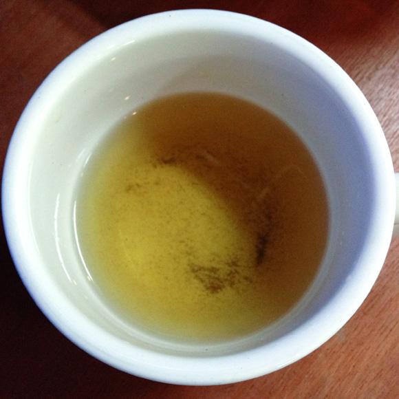 ผมทดลองใส่ portafilter ที่เคาะกากทิ้งไปแล้วกลับเข้าไปในหัวกรุ๊ป แล้วกดน้ำร้อนเปล่าๆ ให้ไหลผ่าน portafilter ไป แล้วเอาถ้วยขาวๆ รองน้ำมาดู ได้ตามภาพที่เห็นข้างล่างนี่ครับ