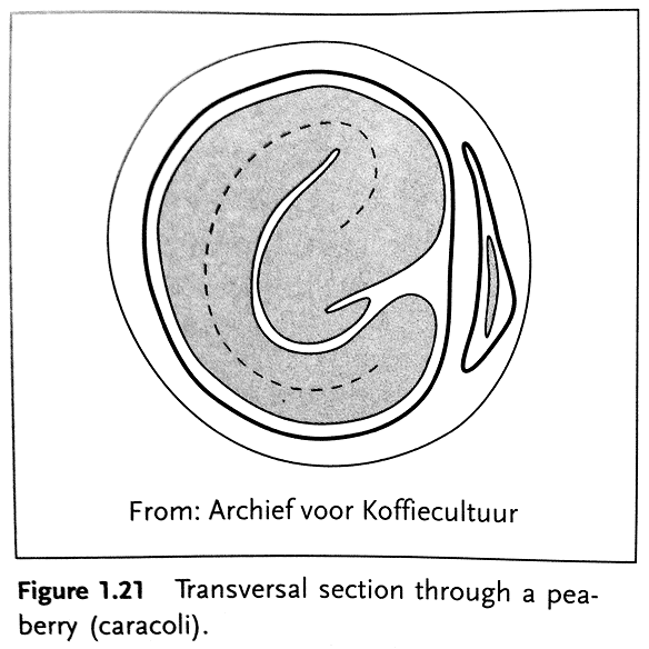 ภาพด้านบนยืมมาจากบล็อกของ James Hoffmann ครับ สังเกตดูจะพบว่าเมล็ดกาแฟจะเป็นทรงกลมมากกว่าเมล็ดกาแฟปกติที่จะมีด้านแบนราบหนึ่งด้าน ตามตำราแล้วจะต้องเรียกว่า peabean จึงจะถูกต้องเหมาะสมกว่า เพราะ berry คือผลของกาแฟ ซึ่งผลกาแฟปกติกับพีเบอรี่ก็ดูไม่ได้ต่างกันนัก แต่ถ้าเป็นเมล็ดต้องใช้คำว่า bean และรูปทรงของเมล็ดมีลักษณะกลมๆ เหมือนเมล็ดถั่ว อย่างไรก็ตาม คำว่าพีเบอรี่ก็ใช้กันมานานแล้วอย่างกว้างขวางทั่วโลก และมีบันทึกอยู่ในพจนานุกรม จะไปเปลี่ยนก็จะโดนตำหนิเหมือนเวลาท่านบัณฑิตทั้งหลายต้องการจะเปลี่ยนคำทับศัพท์ภาษาอังกฤษในภาษาไทยให้ถูกต้อง