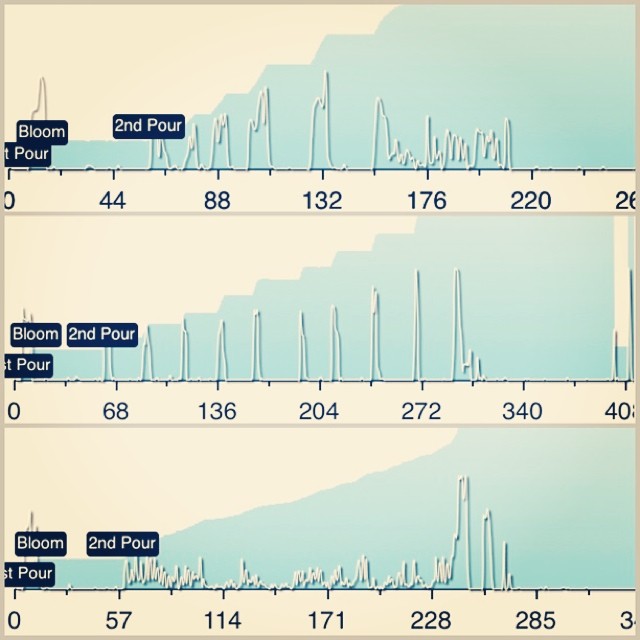 แถบสีฟ้าในกราฟที่เห็นคือน้ำหนักของน้ำที่เรารินลงไปโดยรวม ส่วนเส้นที่ยึกยือนั้นคือปริมาณการรินในแต่ละช่วงเวลา ทุกครั้งที่ผมดริป ผมจะรินน้ำลงไปครั้งแรกประมาณ 2 เท่าของปริมาณผงกาแฟ พยายามให้โดนผงกาแฟทั้งหมด และทิ้งไว้ 45 วินาทีให้ผงกาแฟได้ชุ่มน้ำอย่างสม่ำเสมอ เรียกว่าช่วง wetting หลังจากนั้นในกราฟบนสุดผมรินโดยยกกาแฟให้สูงและเร่งให้น้ำไหลลงไปเยอะในตอนแรกเพื่อเร่งให้ extraction ออกมาเยอะ และเลี้ยงปริมาณน้ำให้แค่ปริ่มๆ ในตอนท้ายเพื่อให้ hydrolysis ออกมาเต็มที่ ใช้เวลาในการชงประมาณ 3 นาทีกว่าๆ ในกราฟที่สองผมรินปกติโดยแบ่งเป็นช่วงๆ โดยดูจากปริมาณน้ำที่ผงกาแฟรับได้โดยไม่ให้มีผงกาแฟที่แห้งด้านบนสุด ใช้เวลาในการชงประมาณ 5 นาที ส่วนกราฟล่างสุดคือพยายามรินเบาๆ ในตอนแรกให้น้ำอยู่ปริ่มผงกาแฟตลอดเวลา และเร่งในตอนท้ายนิดเดียว ใช้เวลาในการริน 4 นาทีกว่าๆ และปล่อยให้น้ำซึมไปเรื่อยๆ
