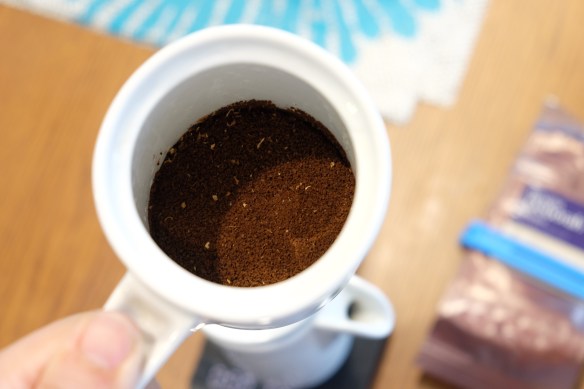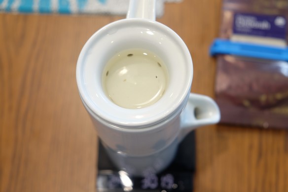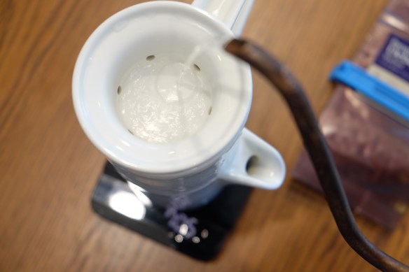 เมื่อรินน้ำเสร็จแอบเปิดดูหน่อย น้ำกาแฟกำลังค่อยๆซึมผ่านผงกาแฟลงไปเพื่อสกัดรสชาติอันยอดเยี่ยมออกมา