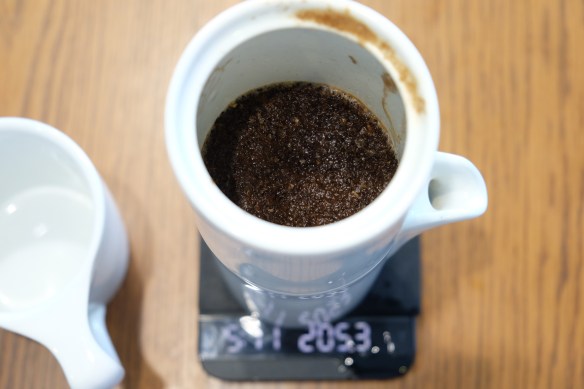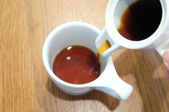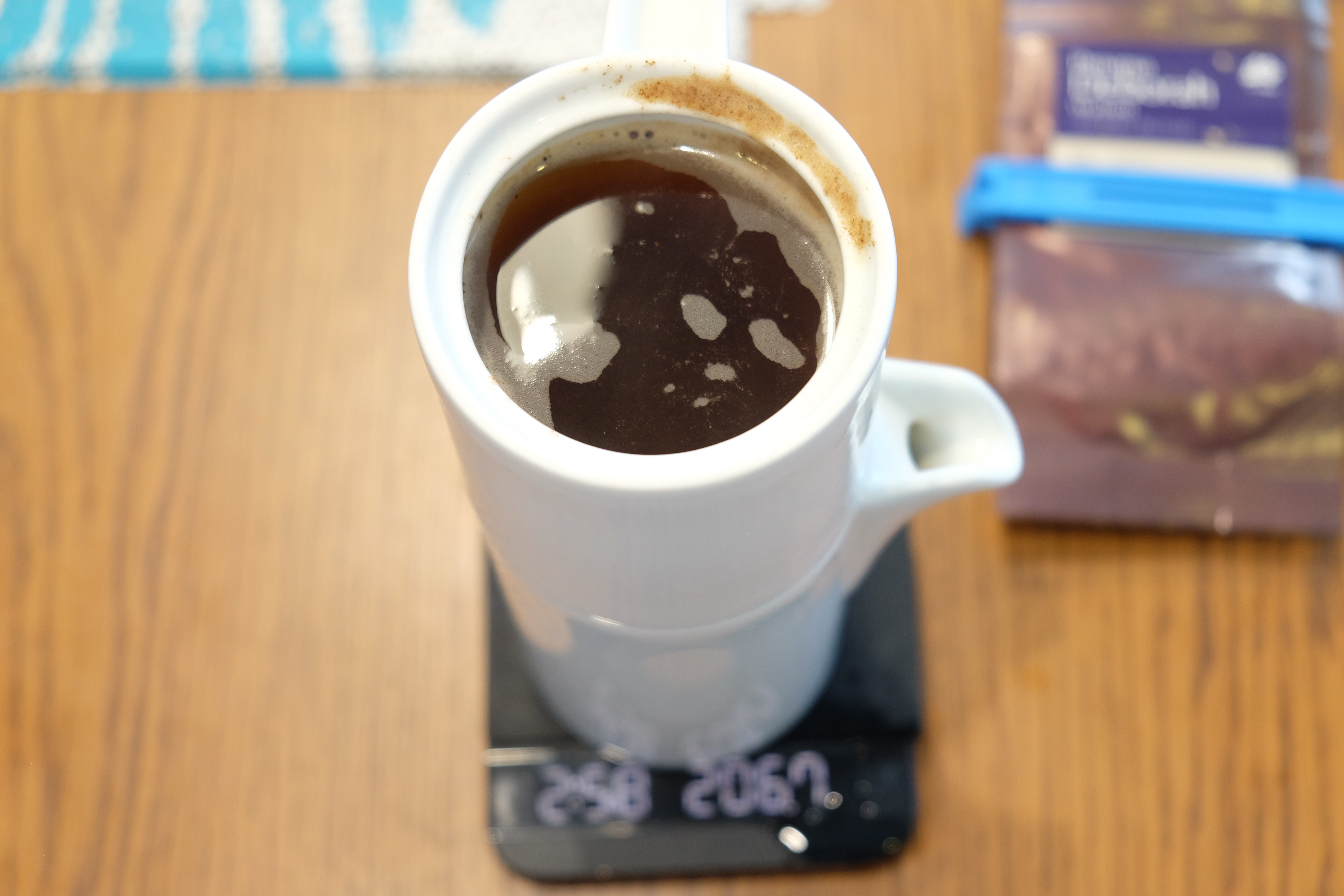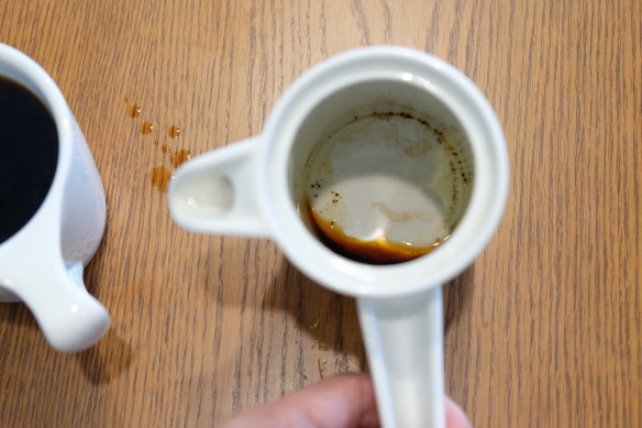 เวลารินจนใกล้ๆจะหมดให้ระวังนิดนึงครับ ก้นภาชนะด้านล่างอาจมีตะกอนกาแฟอยู่บ้าง ถ้าไม่เทแรงเกินไปก็จะไม่ลงไปอยู่ในถ้วย