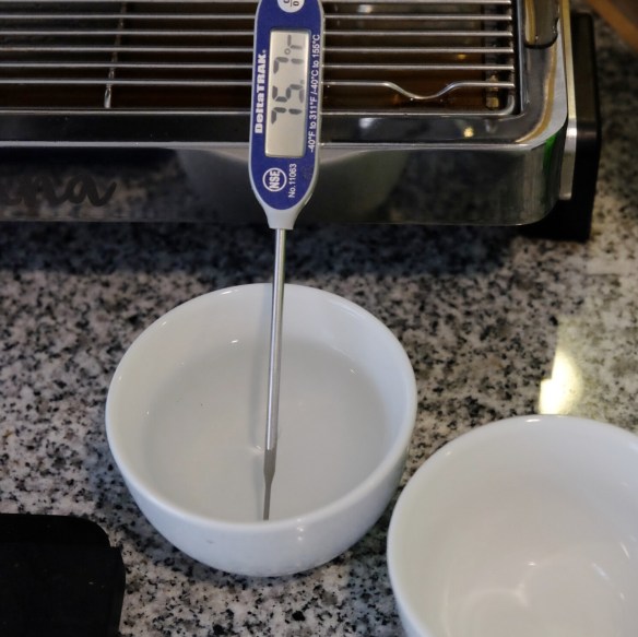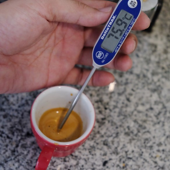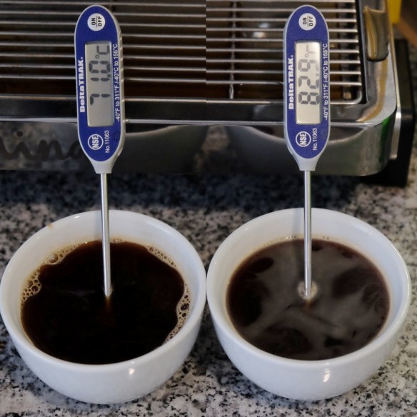 ปกติแล้วอุณหภูมิของช็อตเอสเพรสโซที่ออกมาจากก้น portafilter จะอยู่ที่ประมาณ 88-90 องศา เมื่อไหลลงมาอยู่ในถ้วยก็จะเริ่มเสียอุณหภูมิให้สภาพแวดล้อมไปอีก ในถ้วยเอสเพรสโซที่อุ่นจัดช็อตกาแฟมีอุณหภูมิประมาณ 70 กว่าองศา