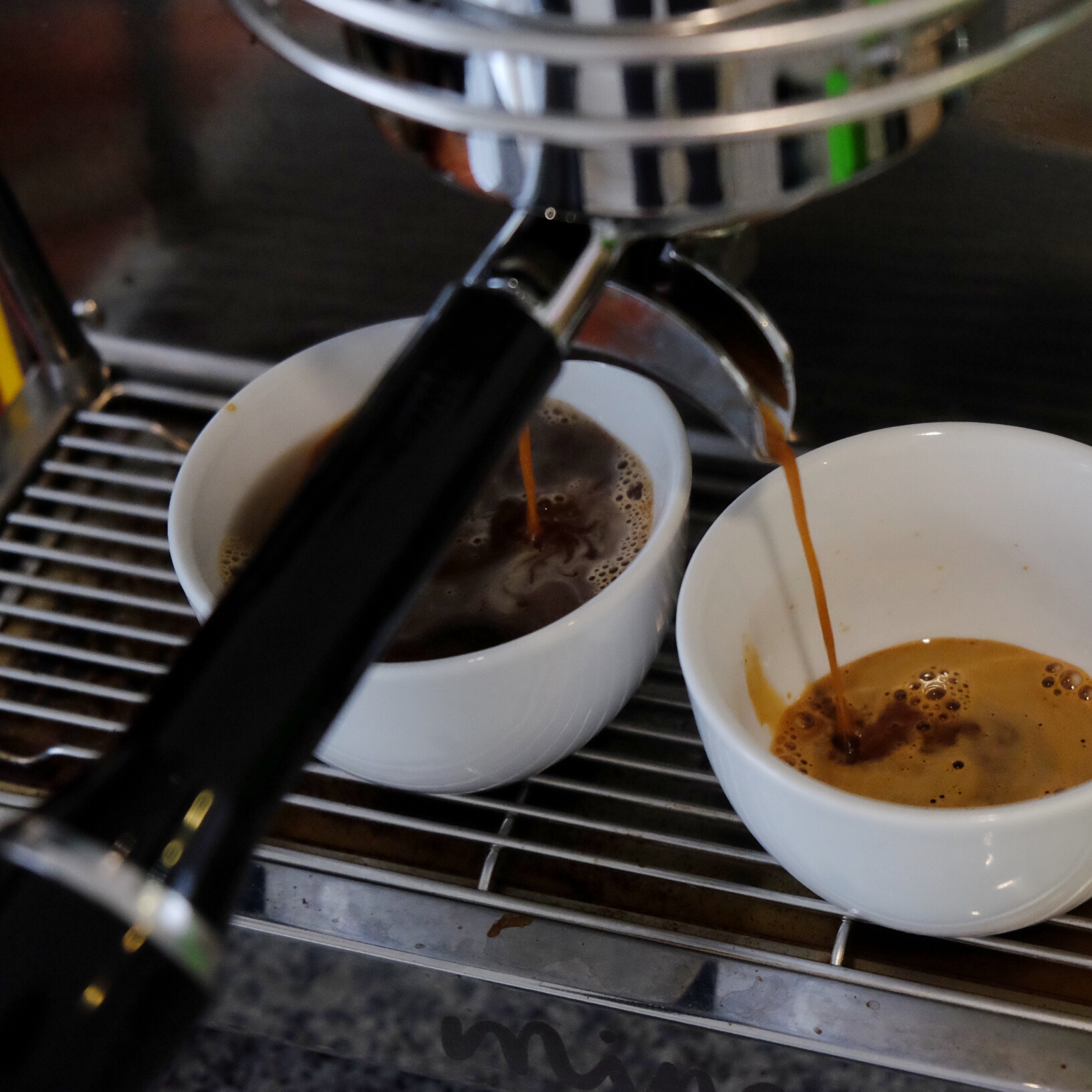 หลังจากนั้นเราทดลองทำช็อตกาแฟลงในถ้วย สำหรับวันนี้เราใช้กาแฟ Rwanda Musasa อายุประมาณ 45 วัน คั่วค่อนข้างอ่อนสำหรับชงดริป ช็อตกาแฟเลยไม่ค่อยสวยเท่าไหร่ ใช้กาแฟ 19 กรัม ได้น้ำกาแฟ 38 กรัม ด้ามชง double spout ฝั่งนึงไหลลงบนน้ำร้อนที่อุณหภูมิประมาณ 70 กว่าๆ อีกฝั่งลงในถ้วยอุ่นๆแล้วกดน้ำร้อนจากเครื่องราดลงไปตามแบบฉบับอเมริกาโนทั่วไป