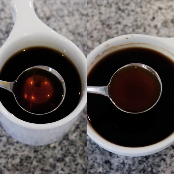 ทีนี้ผมทดลองชิมกาแฟเทียบกันระหว่างกาแฟดริปกับกาแฟอเมริกาโน โดยใช้กาแฟ Cento Espresso ของเราที่เป็นกาแฟคั่วกลางสำหรับชงเอสเพรสโซ กาแฟดริปถ้วยซ้าย (V60 สัดส่วน 1:15 อุณหภูมิน้ำเริ่มต้น 92องศา) ให้รสชาติขมเฝื่อน มีกลิ่นยาง ส่วนอเมริกาโนถ้วยขวาที่ชงด้วยวิธีการแบบด้านบน แม้จะขุ่นกว่าและเหมือนมีตะกอนนิดๆ แต่ให้รสชาติหวาน มีบอดี้ดี ไม่มีกลิ่นกระดาษ และมีมิติที่ดีกว่าอย่างเห็นได้ชัด