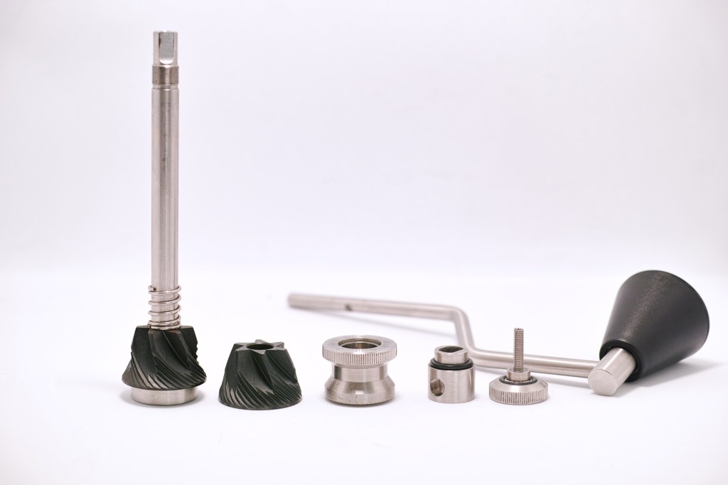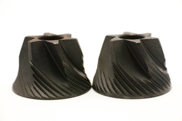 เนื่องจากได้ทราบชื่อเสียงมาว่า Kinu บดกาแฟหยาบได้ดีมาก พอผมได้มาก็หาทางเปลี่ยนฟันบดเป็นฟันบดสำหรับดริปเลย โดยการถอดก็ไม่ได้ยากอะไร ไม่ต้องใช้เครื่องมือใดๆ ภายในตัวเครื่องบดจะมีชุดลูกปืนสองชุดบนล่างเพื่อให้แกนฟันบดตัว inner burr ได้ center และเวลาบดไม่ขยับไปมา พอถอด inner burr ได้ก็เอามาเทียบกัน สังเกต cutting การออกแบบลวดลายที่ฟันบดจะต่างกันมากทีเดียว ตัวซ้ายปลายร่องด้านล่างที่ผงกาแฟถูกบดออกมาจะกว้างและมุมที่ตัดป้านกว่า เนื้อเหล็กเต็มๆ ไม่สูงนัก เพื่อเปิดช่องให้ผงกาแฟขนาดใหญ่ลอดออกได้ง่ายกว่า ส่วนตัวขวามุมสูงแหลมกว่า มีส่วนที่ผงกาแฟออกมาได้น้อยกว่า